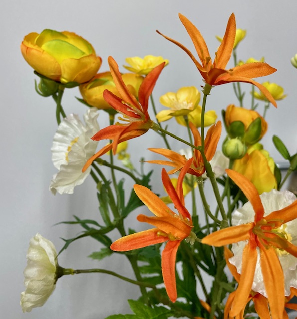 Geel met oranje ranonkel. Hoogte 65 cm. Met 6 bloemen en 3 bloemknoppen 3 vertakkingen.
