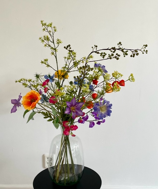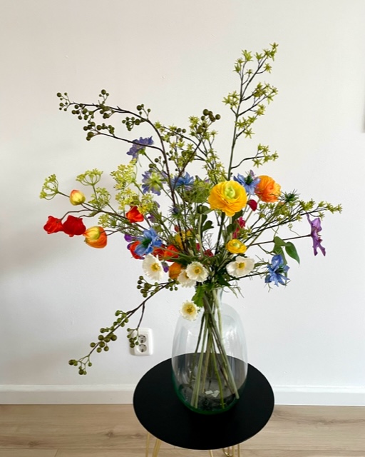 Inhoud: buigzame groene bessen tak. witte kleine papaver, clematis paars, gele ranonkel. Geel/groene bruidsbloem, oranje lampion, gele dille. blauwe duifkruid, pronkerwt in roze en paars. Nigella in blauw. en de Papaver kunstbloem in oranje.